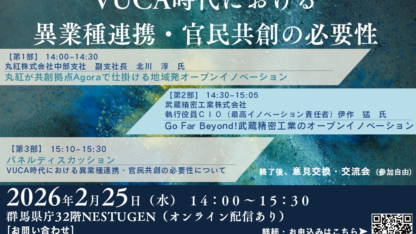 新たなビジネスや地域づくりにチャレンジする人が集まるイノベーション創出拠点として、北関東一帯を眺望する群馬県庁32階に設置した「官民共創スペース」。デジタル技術を活用してアイデアを形にしたい人と事業の発展をめざす企業家、それを支援する人や事業者が集まり交流する場です。アイデアを核に、解決すべき地域課題、人材、デジタル技術、知識などが集積・結合して、新たなイノベーションが次々と生み出され、社会の変革につながる好循環が形成されることをめざします。