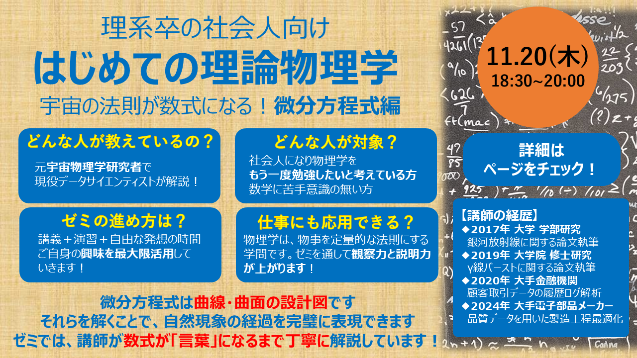 この講義では、宇宙を支配する法則を読み解き、本質を予測する学問──理論物理学を、社会人向けに解説します!