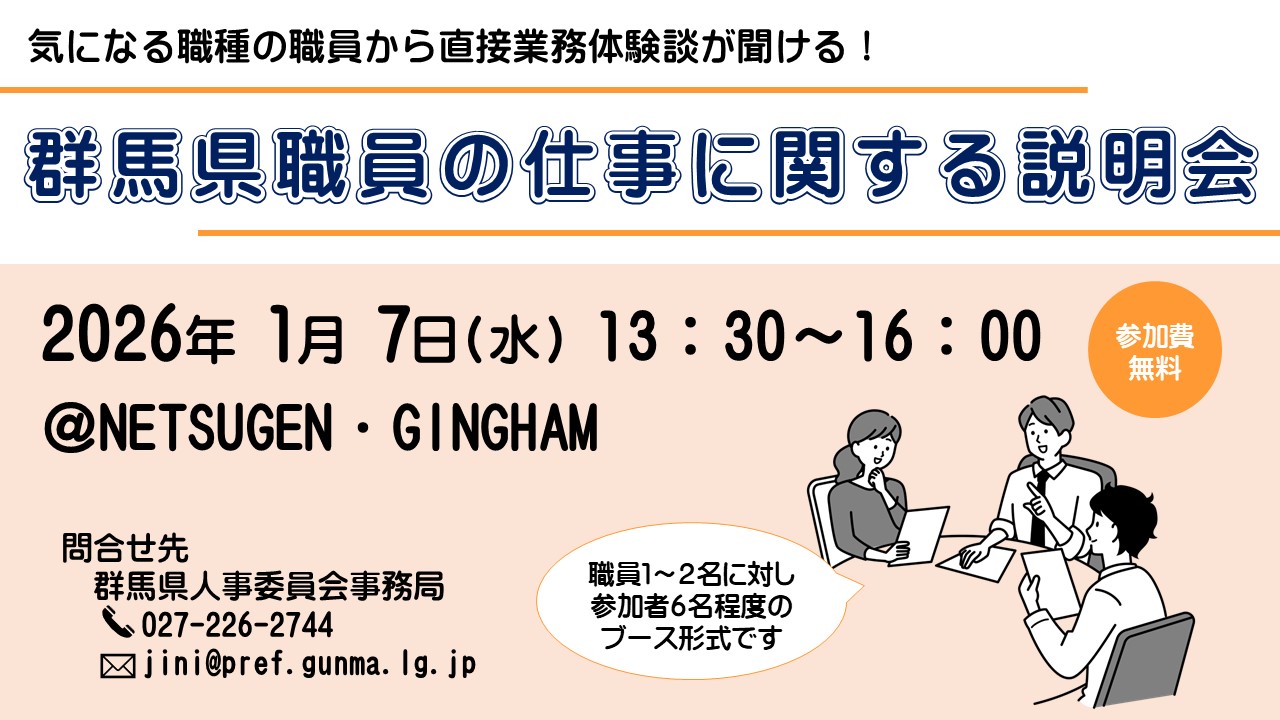 県職員の仕事内容や魅力、また、職員採用試験の制度などについて広く知っていただくため、「群馬県職員の仕事に関する説明会」を開催します。