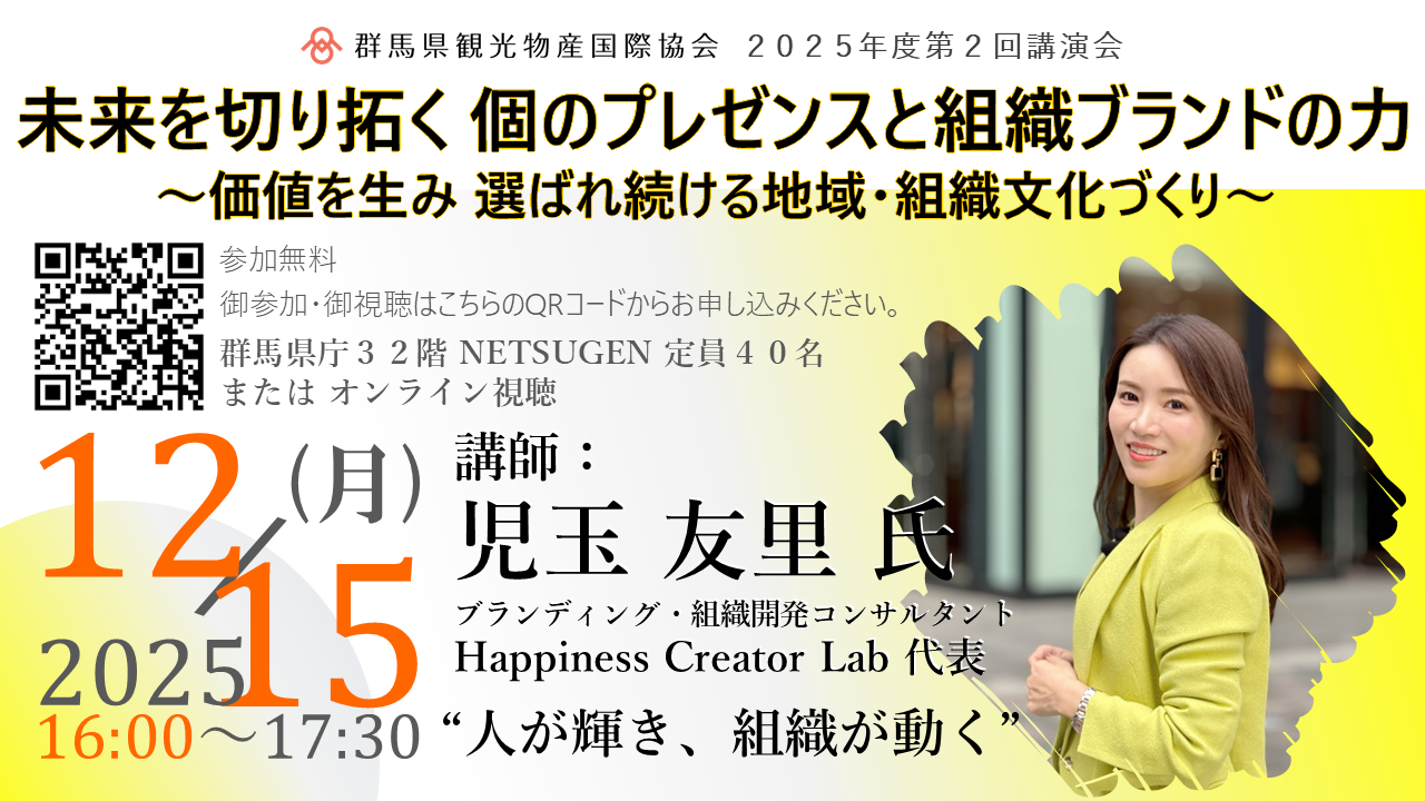 群馬県観光物産国際協会の掲げる“ワクワクできるGUNMAを未来につなぐために”というビジョンへの共感と、そこに関わる一人ひとりへのエールを込めた講演会を開催いたします。