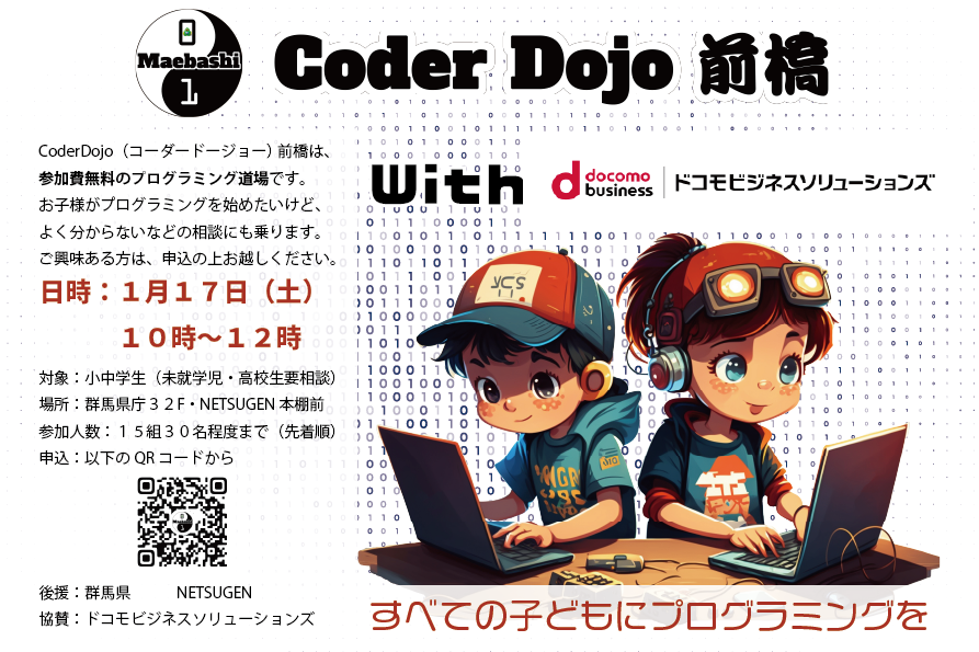 CoderDojo(コーダードージョー) 前橋は、参加費無料でプログラミングを学べる小中学生を対象としたプログラミング道場です。