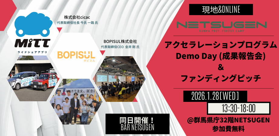群馬県の官民共創スペースNETSUGENが主催する、アクセラレーションプログラム成果発表会(DemoDay)&ファンディングピッチイベントを開催します!