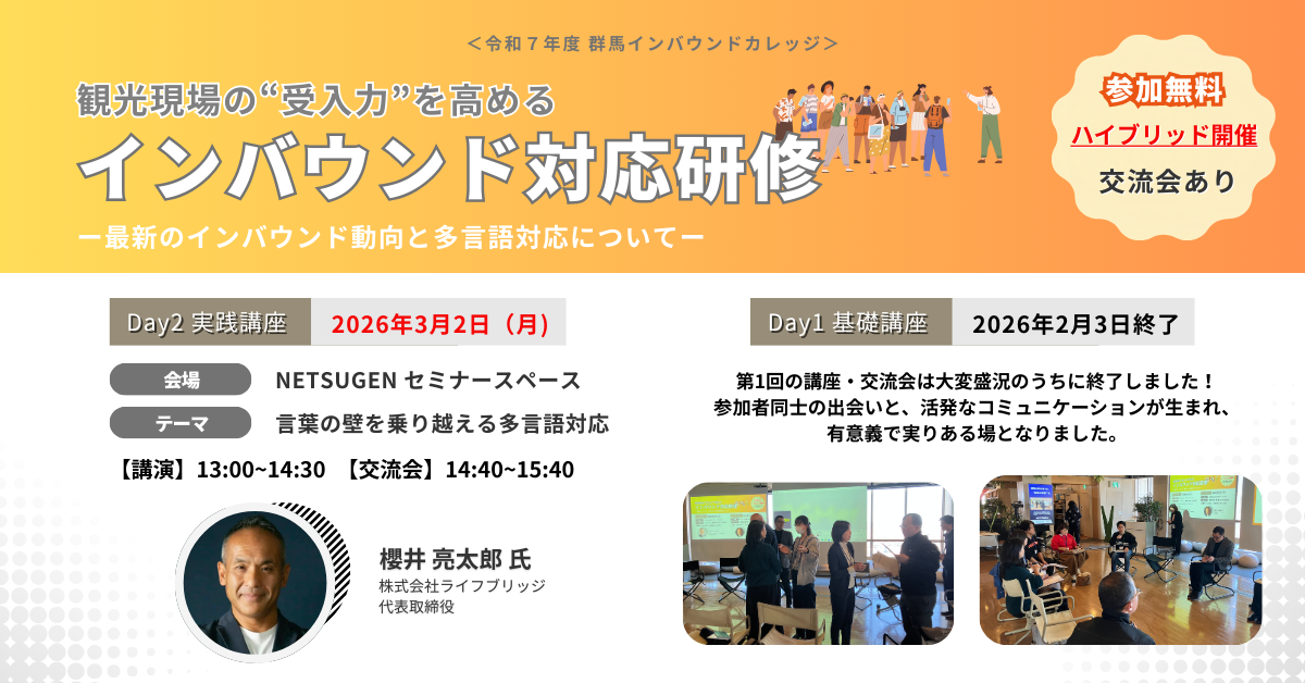 群馬県内の観光事業者の皆様を対象に、インバウンド対応力を高めるための研修会を開催します。会場とオンラインのハイブリッド形式での実施です。会場参加者限定の交流会もございますので、ぜひご参加ください。