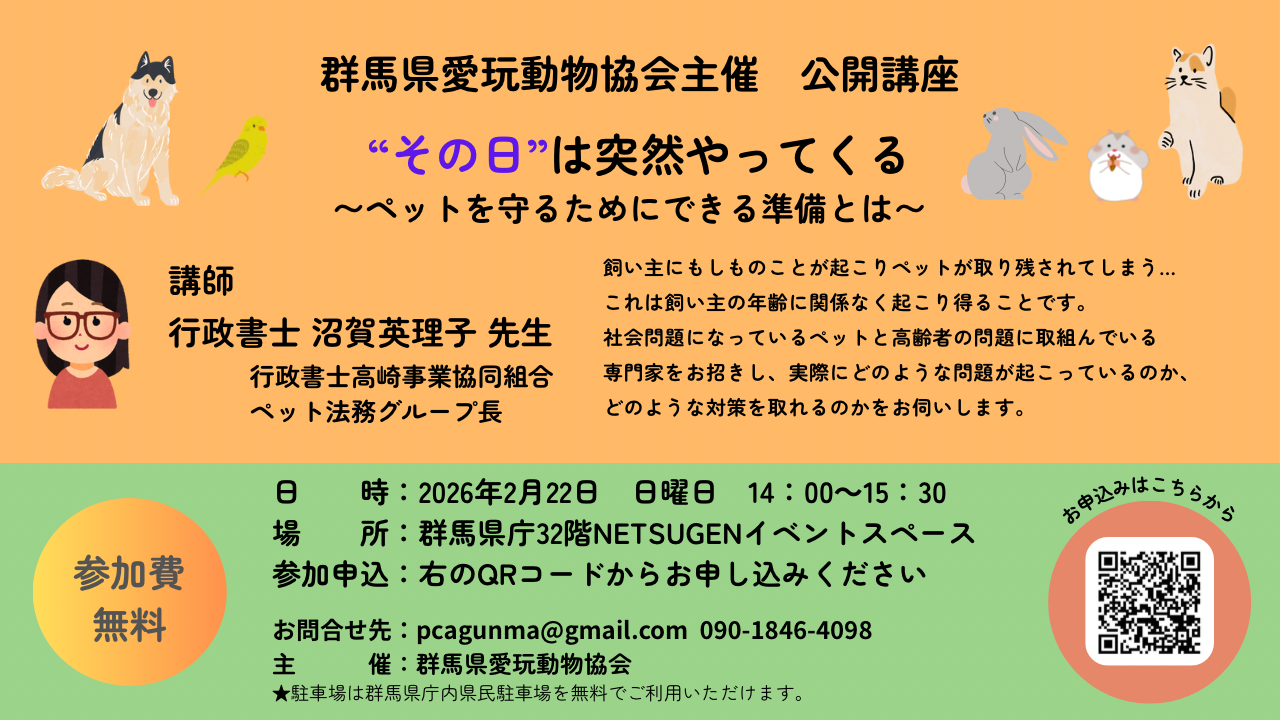 (2/22)群馬県愛玩動物協会主催 公開講座 ”その日”は突然やってくる〜ペットを守るためにできる準備とは〜