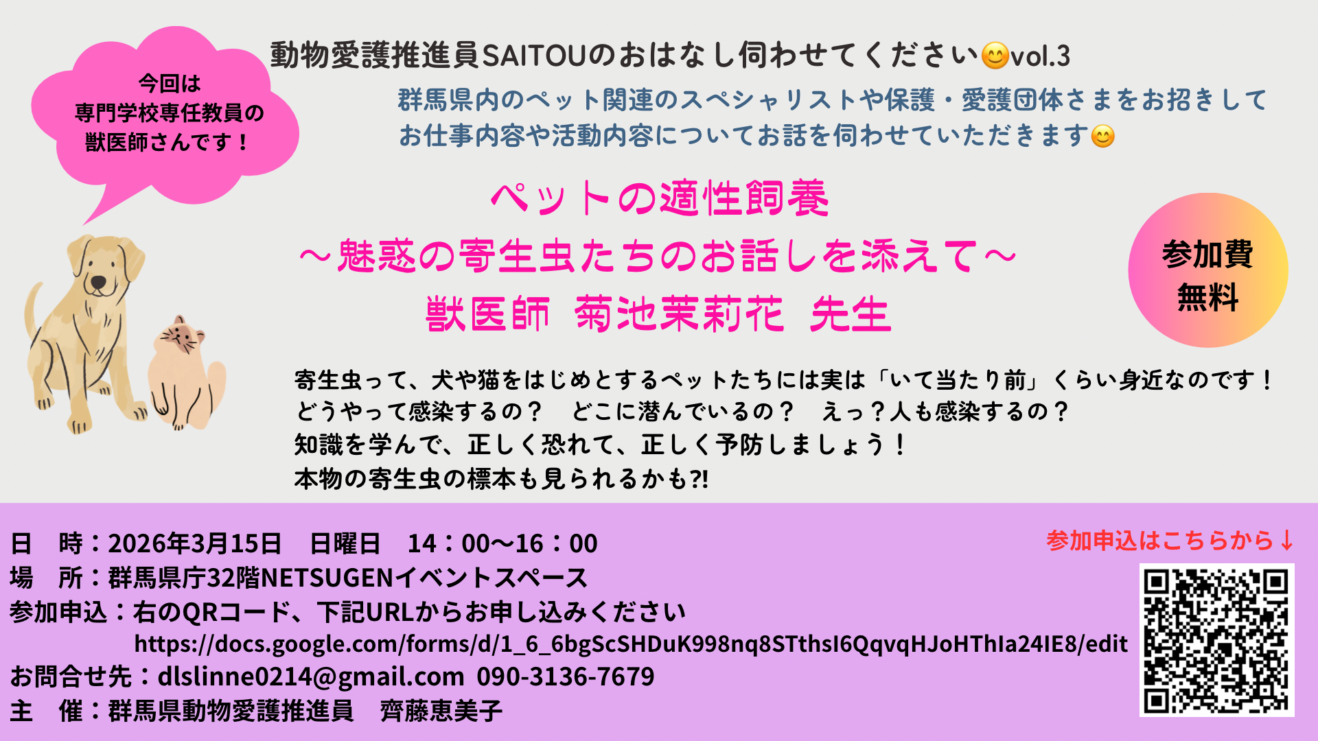 (3/15)動物愛護推進員SAITOUのおはなし伺わせてくださいvol.3「ペットの適性飼養〜魅惑の寄生虫たちのお話しを添えて〜」