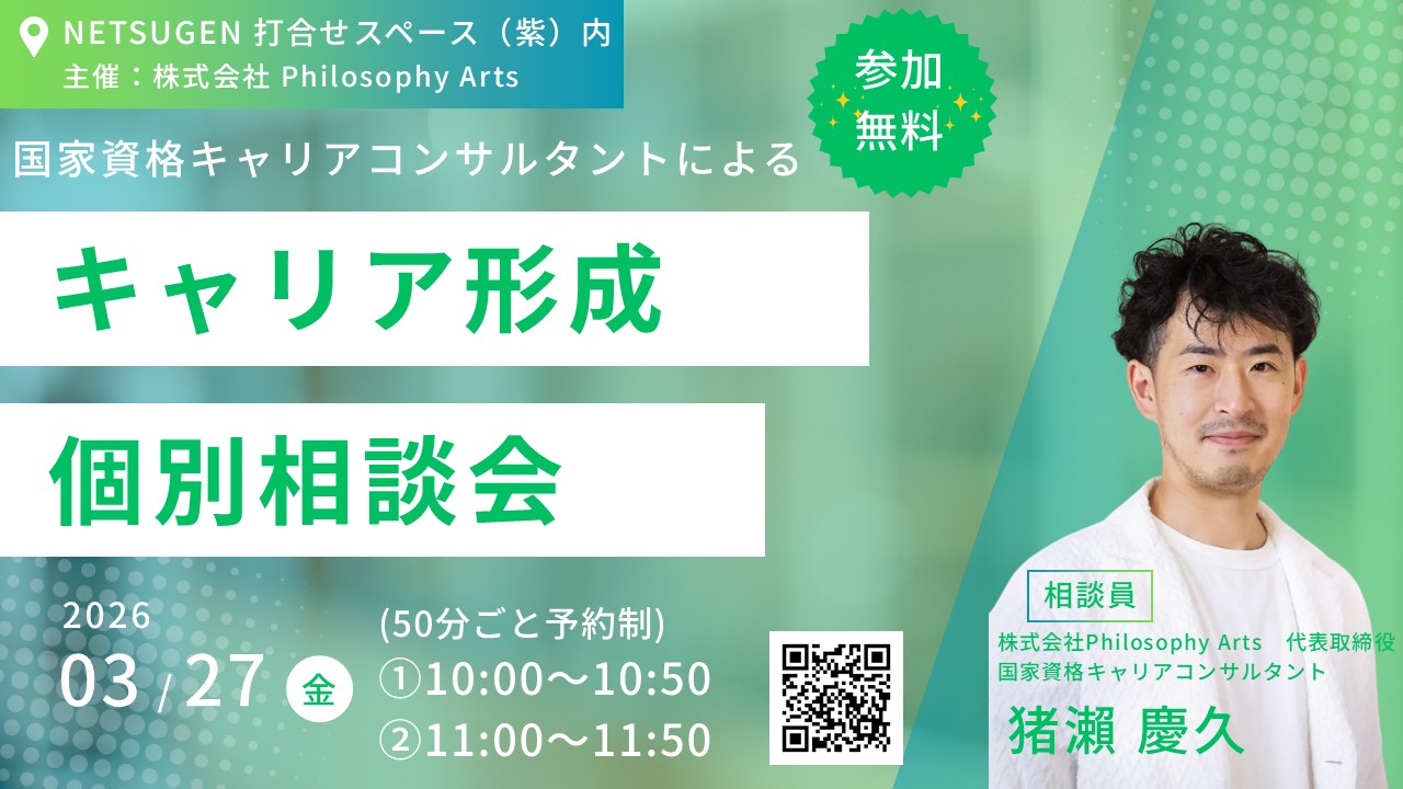 群馬県を中心にキャリア形成支援や組織づくり支援を行っている株式会社Philosophy Arts代表取締役・国家資格キャリアコンサルタントの猪瀨が、NETSUGENにてキャリア形成個別相談会を開催いたします。