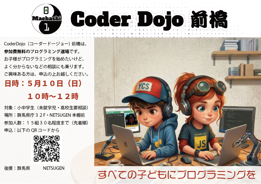CoderDojo(コーダードージョー) 前橋は、参加費無料でプログラミングを学べる小中学生を対象としたプログラミング道場です。