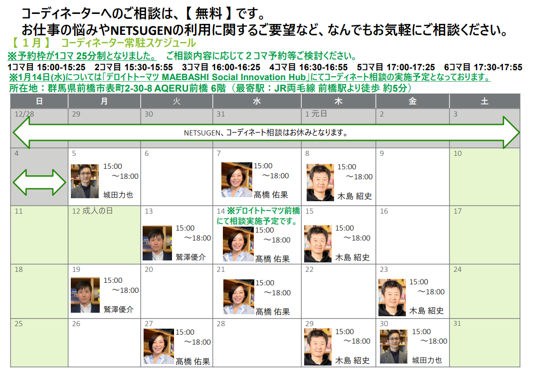 2025.12.22 2026年1月のコーディネーター常駐スケジュールをお知らせします。 2026年1月のコーディネーター常駐スケジュールをお知らせします。 空き状況は予約システムからご確認ください。 みなさまからのご相談をお待ちしております。 ご予約はこちら Tweet Share (NETSUGEN・NETSUGENアライアンス)年末年始の休業のお...